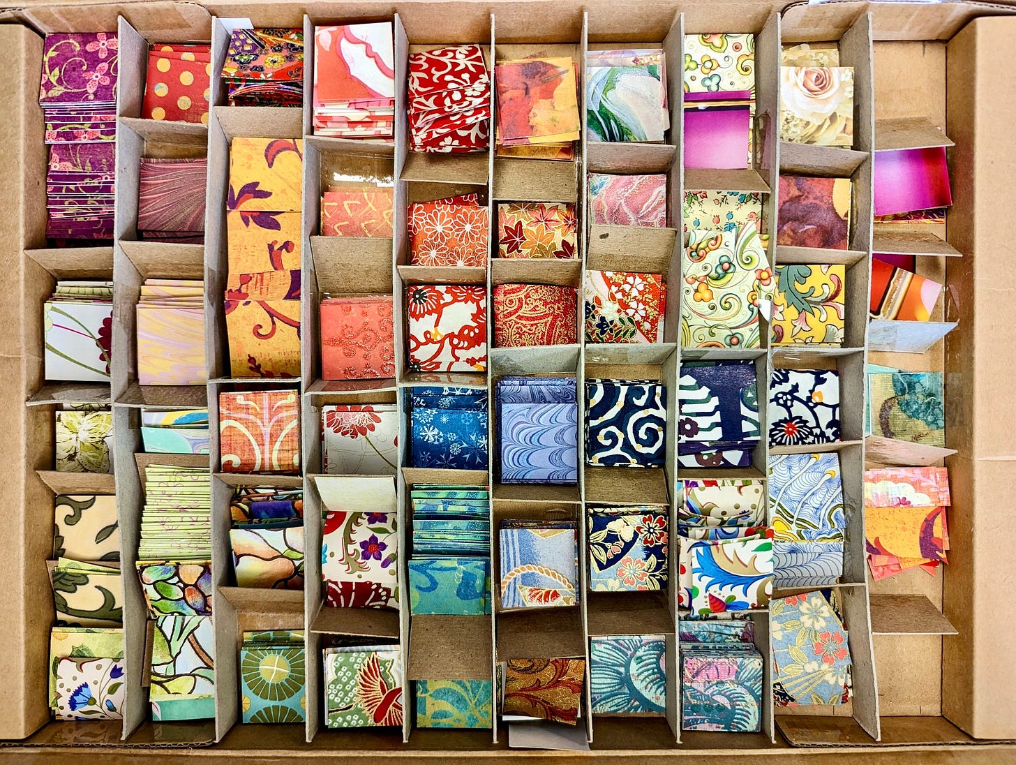 “So then cut up the papers!” my friend Color exclaimed. “That makes them smaller, right?” Like the colorful cut-up squares that I used in making collage cards and boxes years ago (which I ended up giving to Color, then taking it back a few years later!)