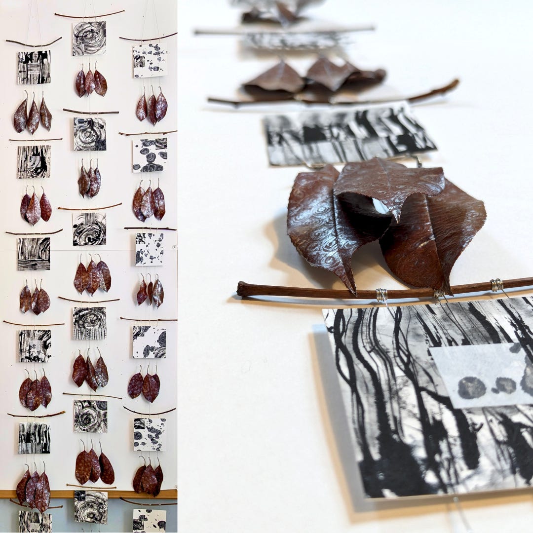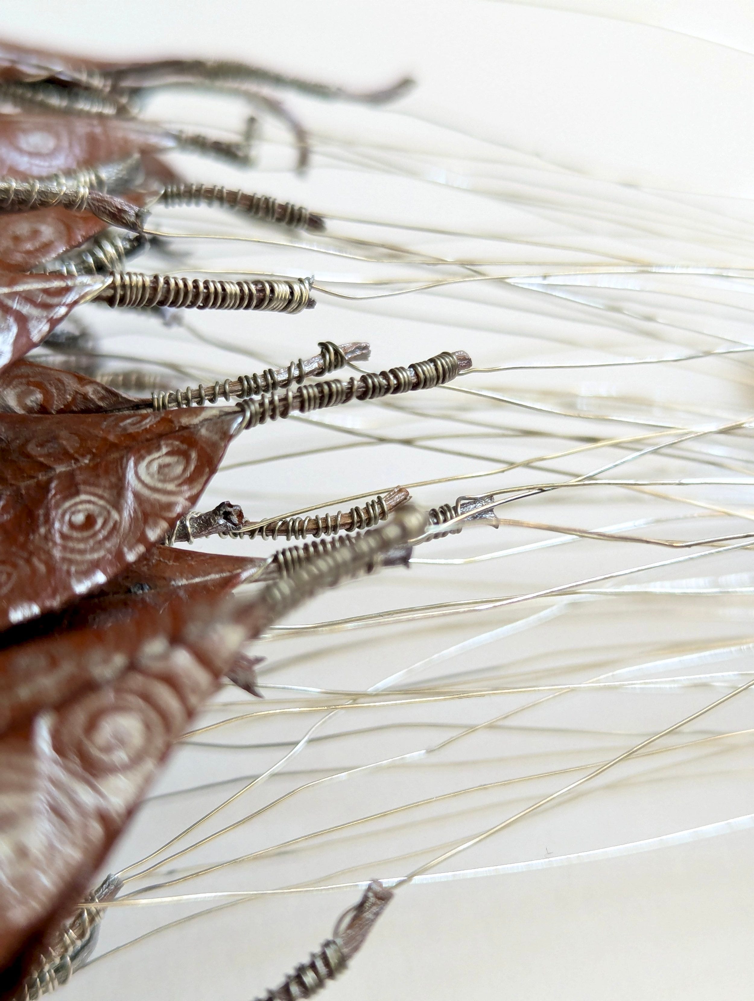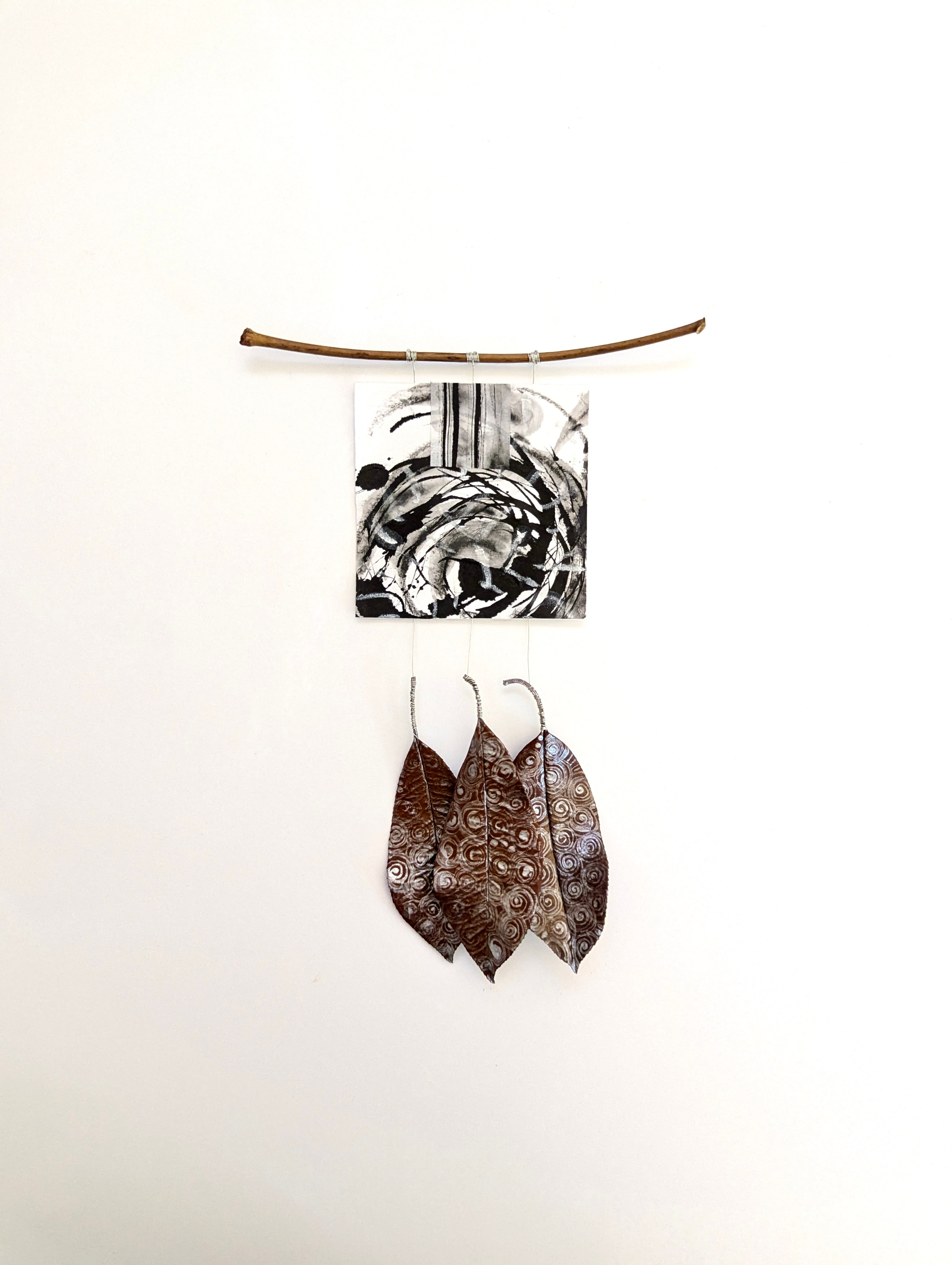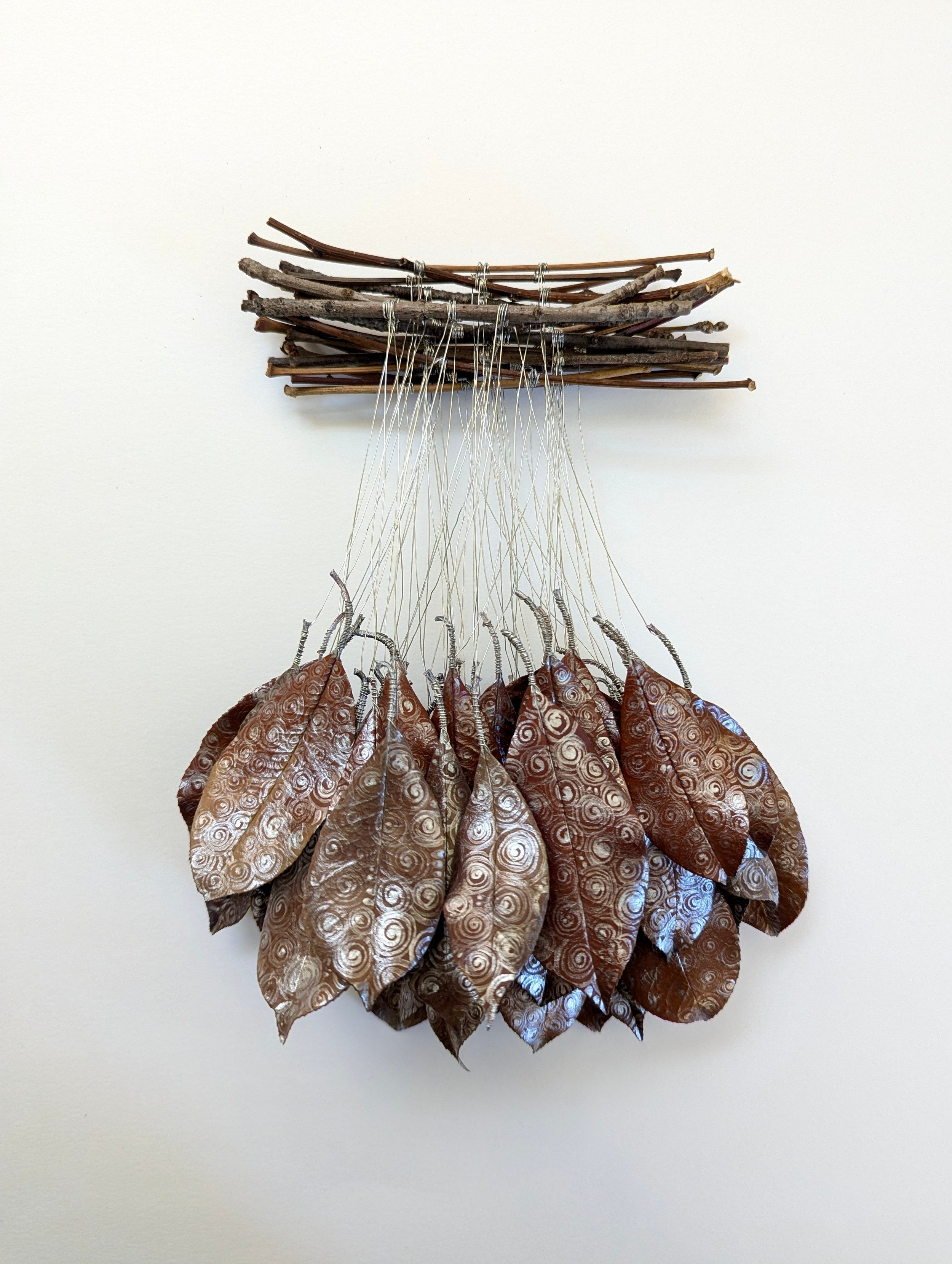 The artist knew, at some point, that she needed to disassemble the long strands of chimes. They were already falling. The strings were cut, and each chime was released. And then each chime was disassembled. The sticks and painted leaves, tethered by thin silver wire, were loosened from the collage square and tucked in close together.