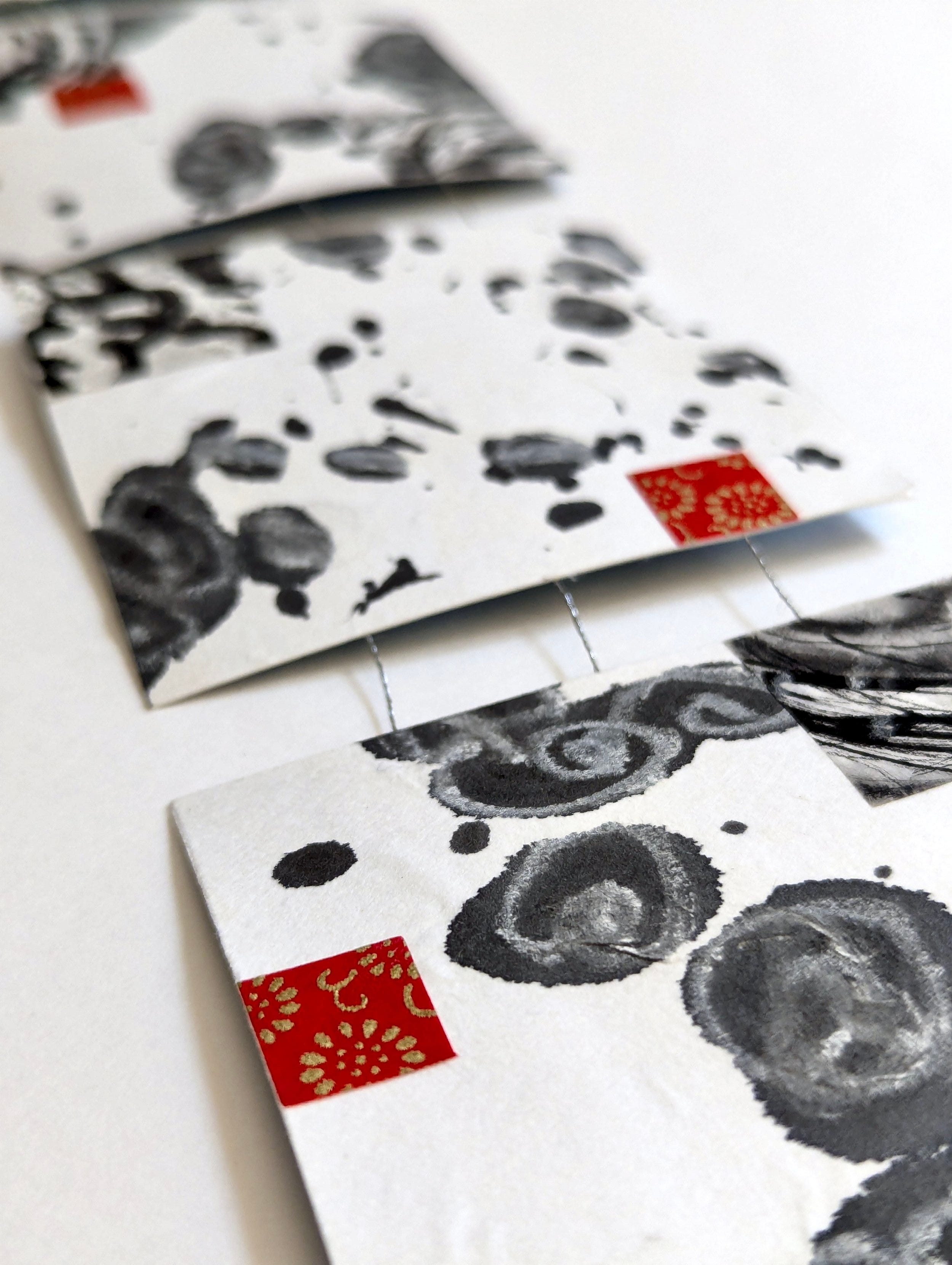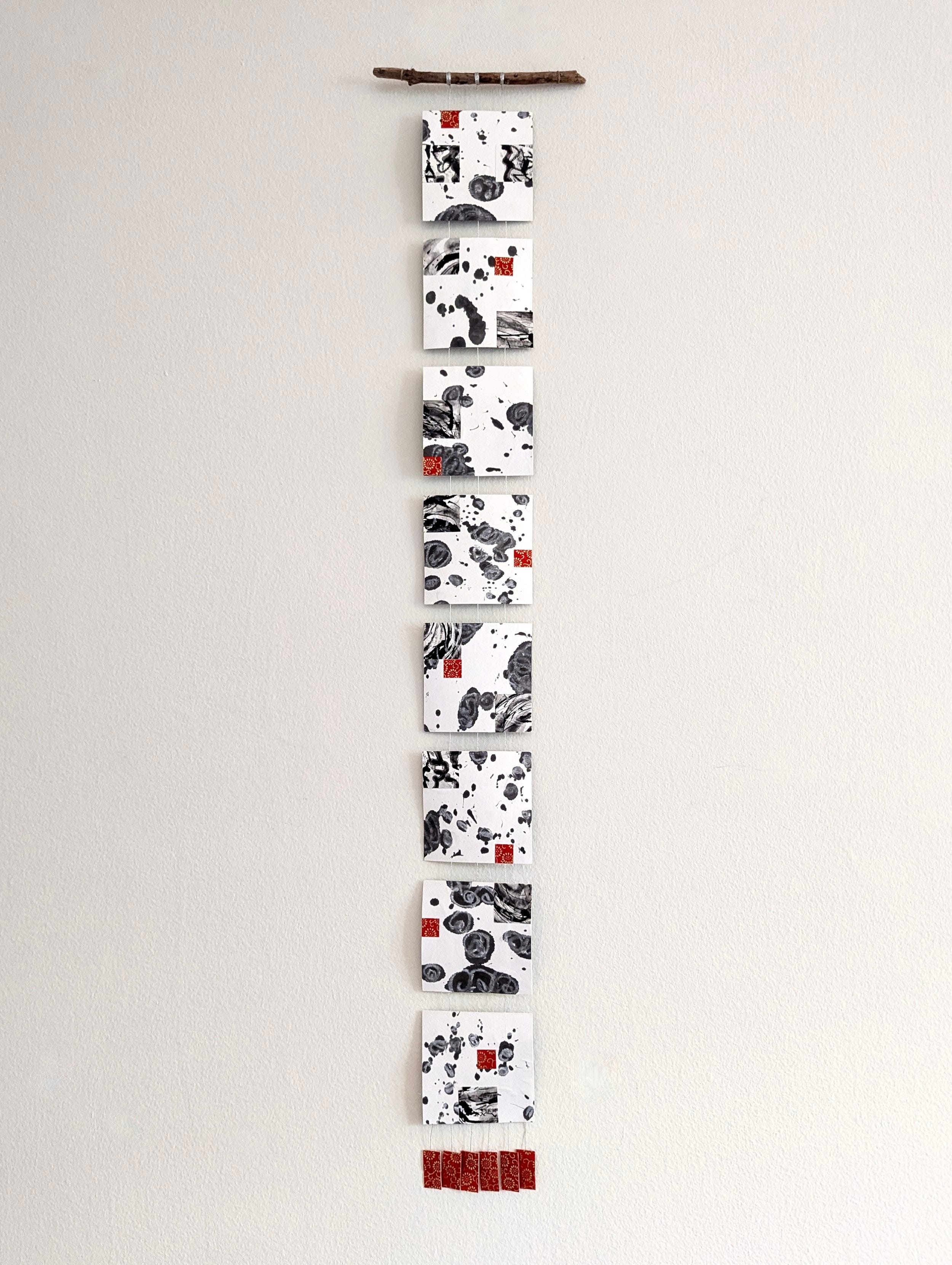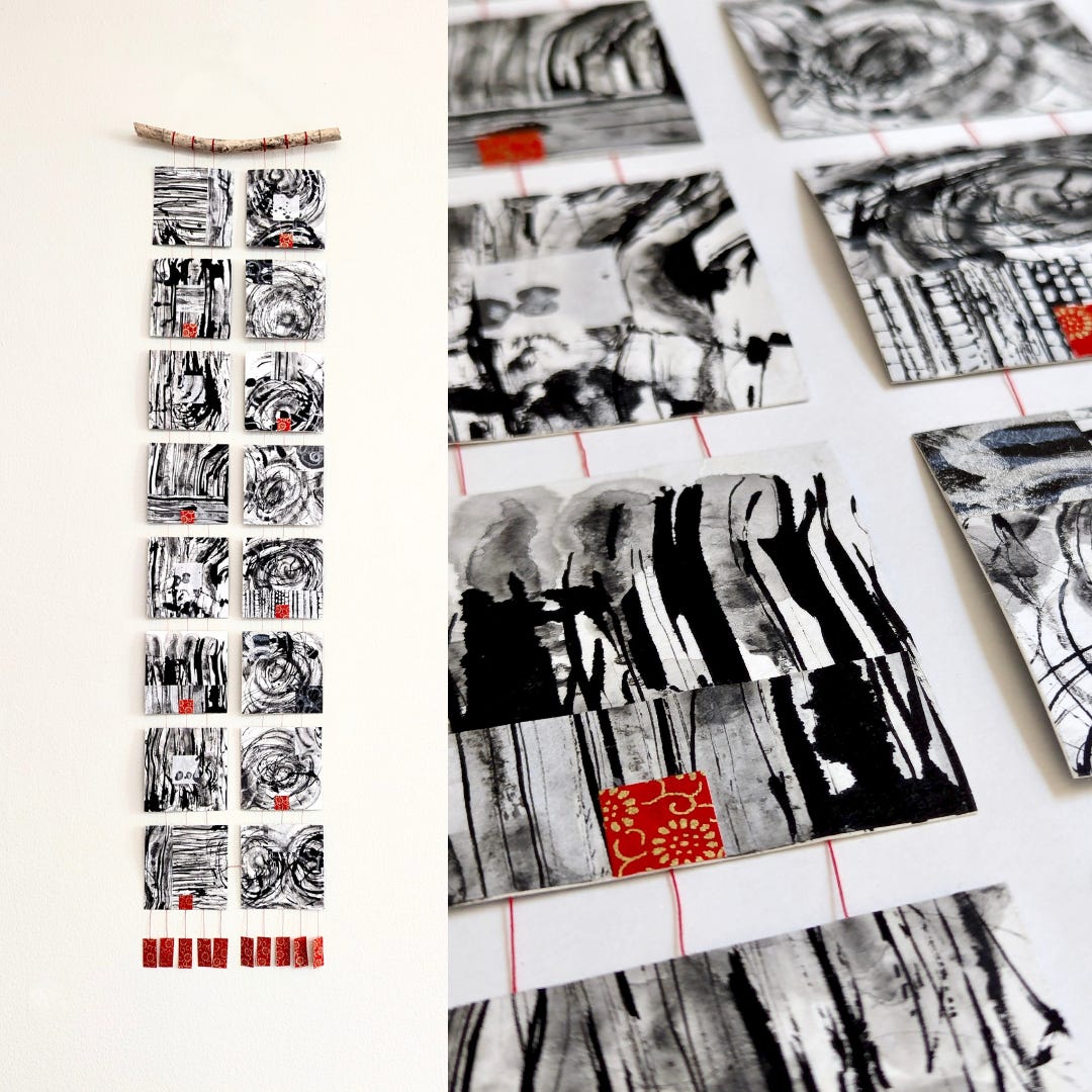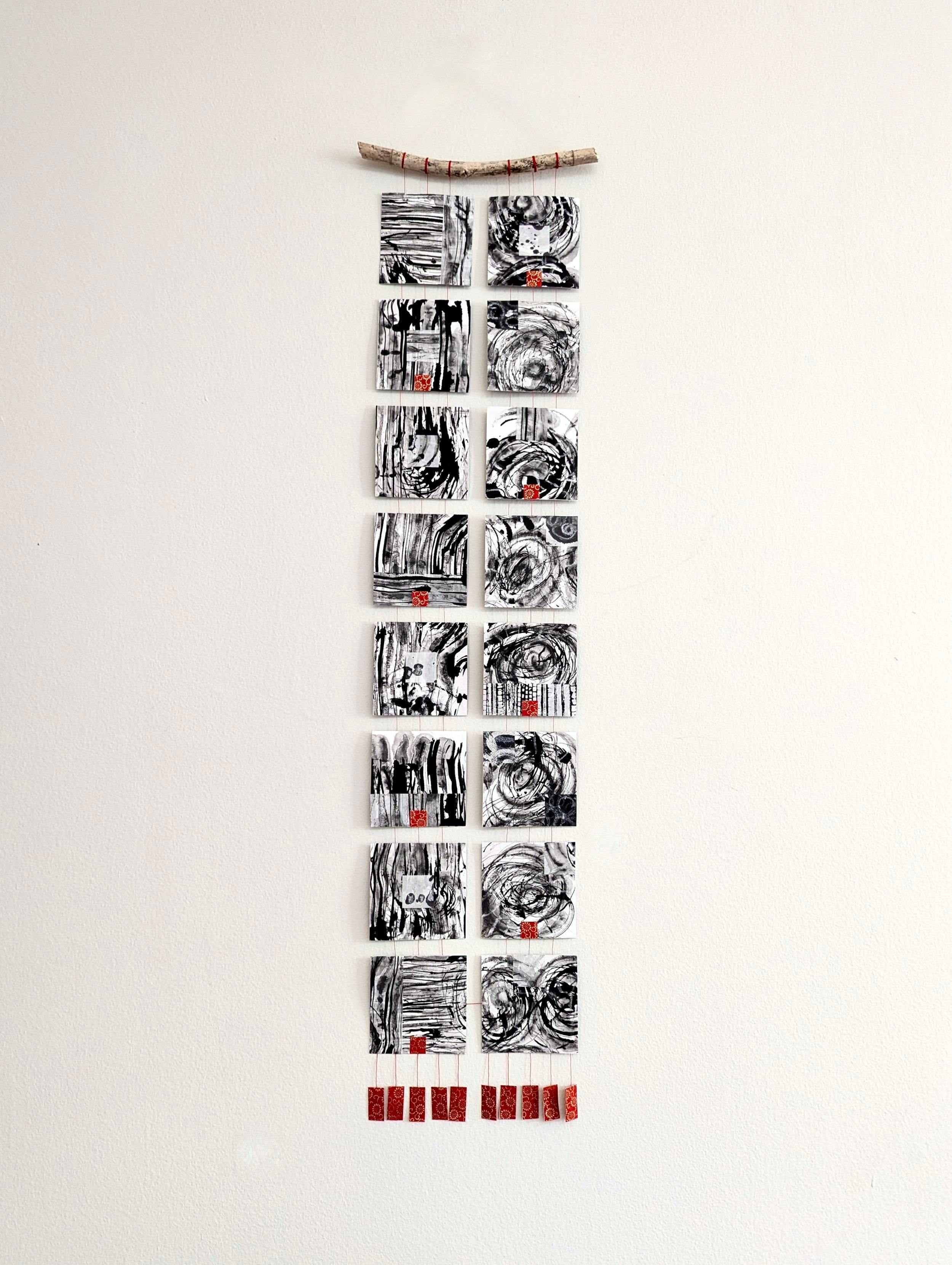 The artist rearranged the collage squares in long rows, then tethered them with string in between, a twig on top, and red tassels on the bottom to make two new expressive banners. The last touch was placing tiny red squares in each of the collage squares.