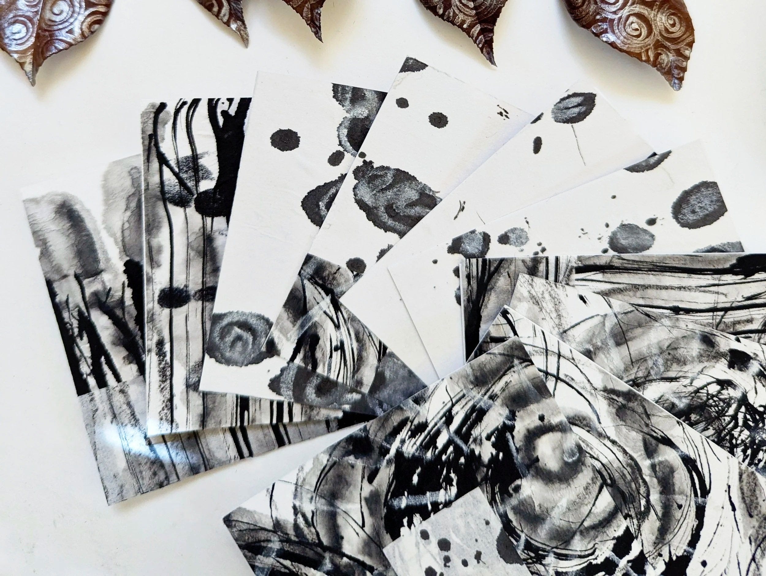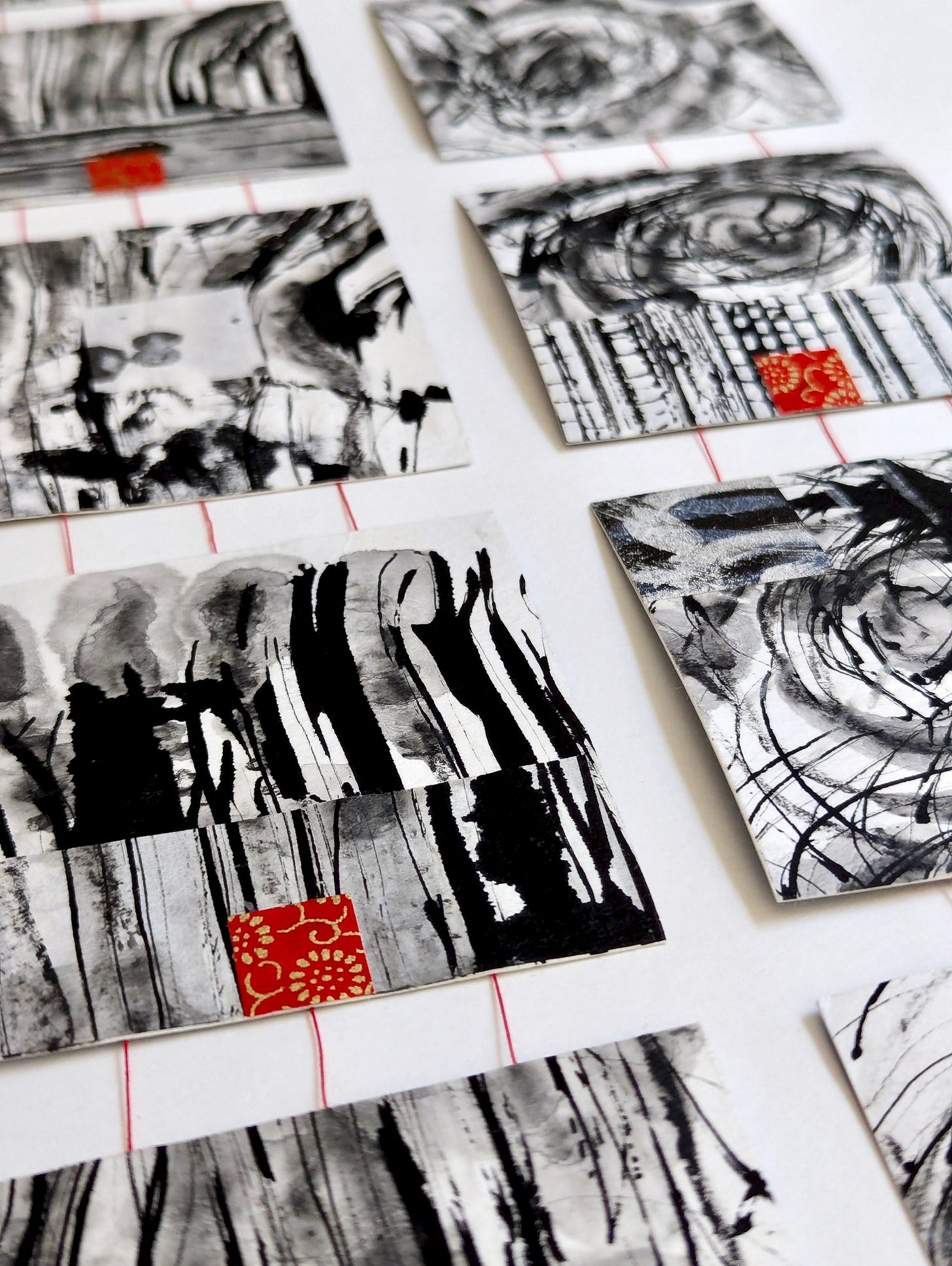 The artist held all the collage squares, released from their own burdens, each with layers of expression and their own movements. Each one felt like a return, a turning, a grounding to itself again. She knew what she wanted to do with them, a simple final expression.